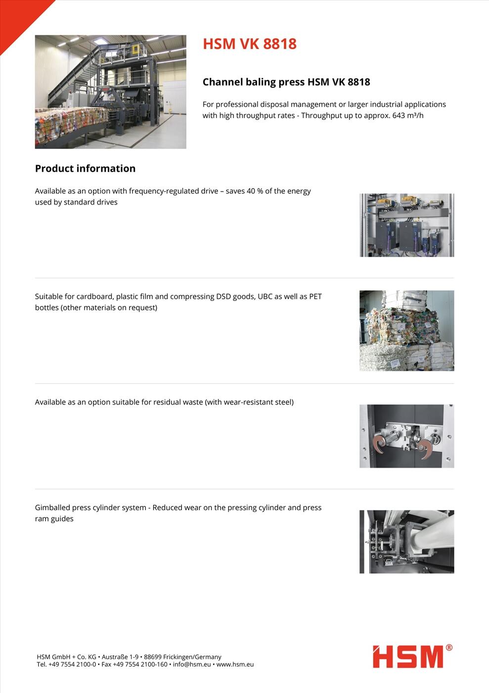 - Máy đóng bành phế liệu là giải pháp giúp các Doanh nghiệp sản xuất, khu chế xuất, kho vận xử lý chất thải rắn ngay tại cơ sở, giúp tiết kiệm chi phí trong hoạt động kinh doanh. HSM VK 8818 là thiết bị công suất tầm trung với năng lực xử lý 418 m³ / giờ với lực ép lên đến 880 kN.